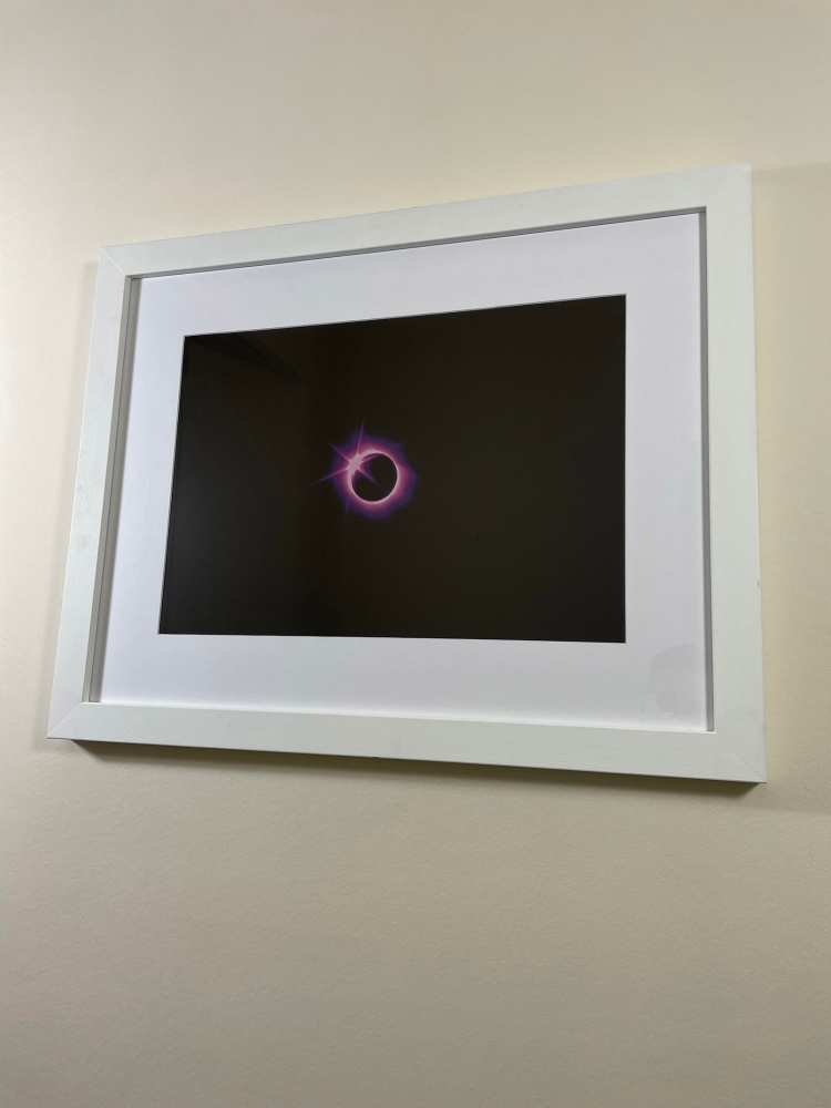 Ingekaderde fotolitho van zonne eclips van de hand van Ann Veronica Janssens uit 2013. Dit werk is gemaakt in een reeks van 4 en ze worden alle vier afzonderlijk aangeboden. Het werk is is met de hand gesigneerd en genummerd door de kunstenaar (zie foto). Ann Veronica Janssens (B, 1956) is een internationale beeldhouwer van het licht, van het geluid en van de ruimte. Ann Veronica Janssens gaat bijna altijd op minimale wijze te werk zonder echt bij de minimal art te horen. Dat haar werk echter wel eens met de minimalistische stroming in verband wordt gebracht komt door de heldere vormgeving en de materiaalkeuze: transparant, glanzend of juist verdicht en schijnbaar ontoegankelijk. De kunstenaar woont en werkt in Brussel. De foto komt uit de reeks 'Museum to scale' uitgegeven door gallerist Ronny Van de Velde. Het geheel wordt vakkundig ingepakt en opgestuurd.