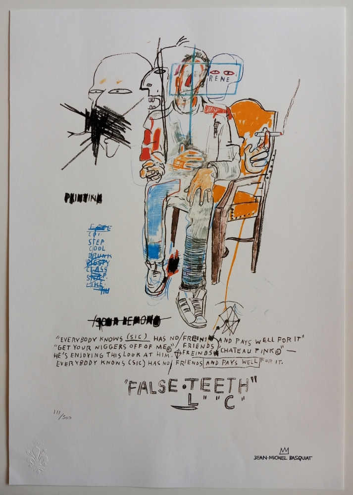 Lithografie op Fabriano Cotton Privilege papier. Gesigneerd in de plaat en genummerd 111/500. Reliëfstempel van de uitgever 'Oro Cartier Edizioni Limitate'. Licentie Andy Warhol Additions Factory. 35*50 cm. Met certificaat. Kunstgebitten impliceren ouderdom en verval en Basquiat neemt de symbolische kracht van het kunstgebit tot een logische conclusie.