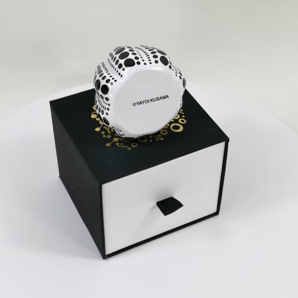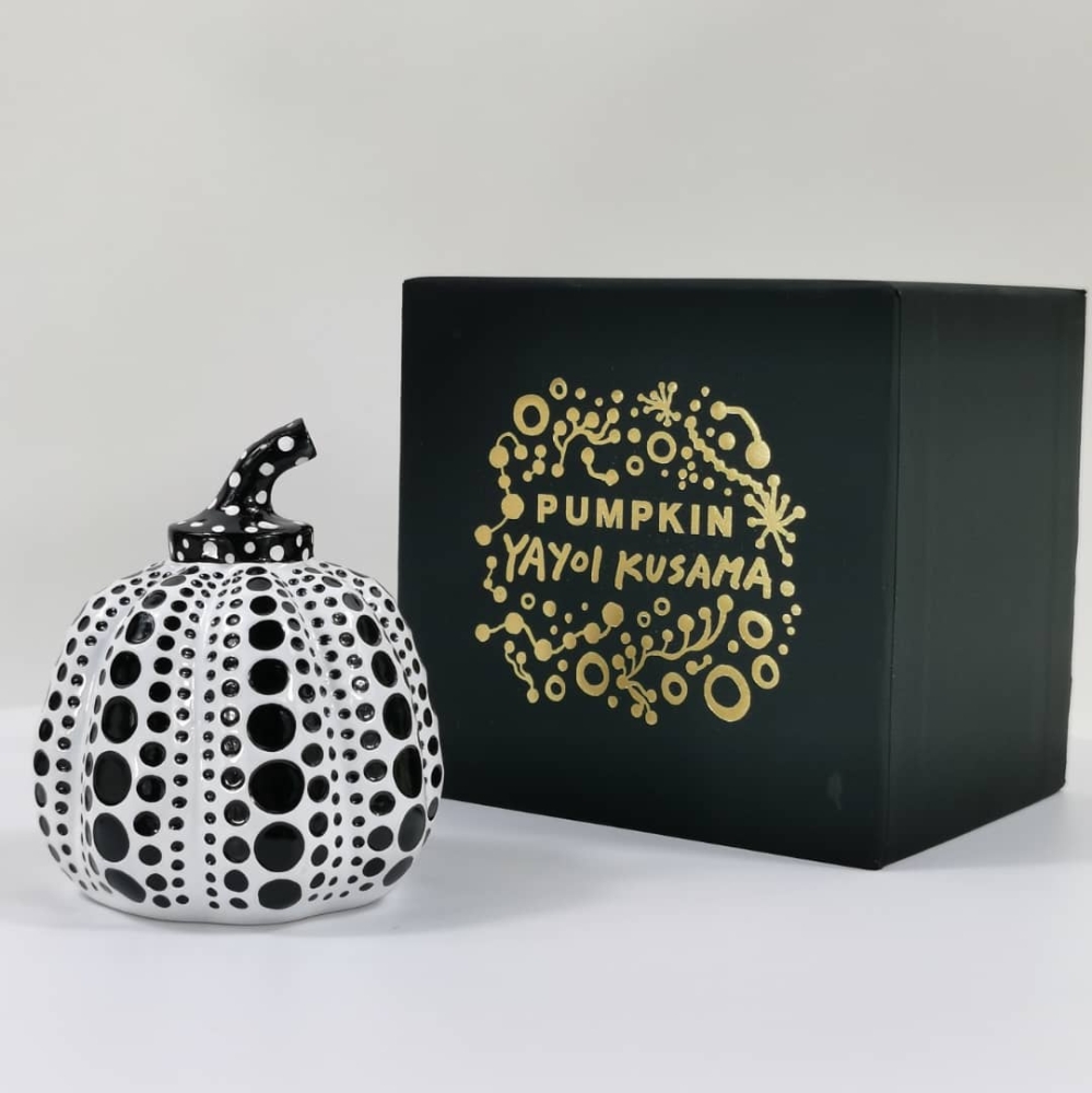 Yayoi Kusama is een beroemde Japanse kunstenaar. Een van zijn bekendste werken zijn zijn pompoenen met stippen. Artiest: Yayoi Kusama (naar) Titel: Pompoen (zwart en wit) Originele doos Afmeting: 8x8x10cm Hars