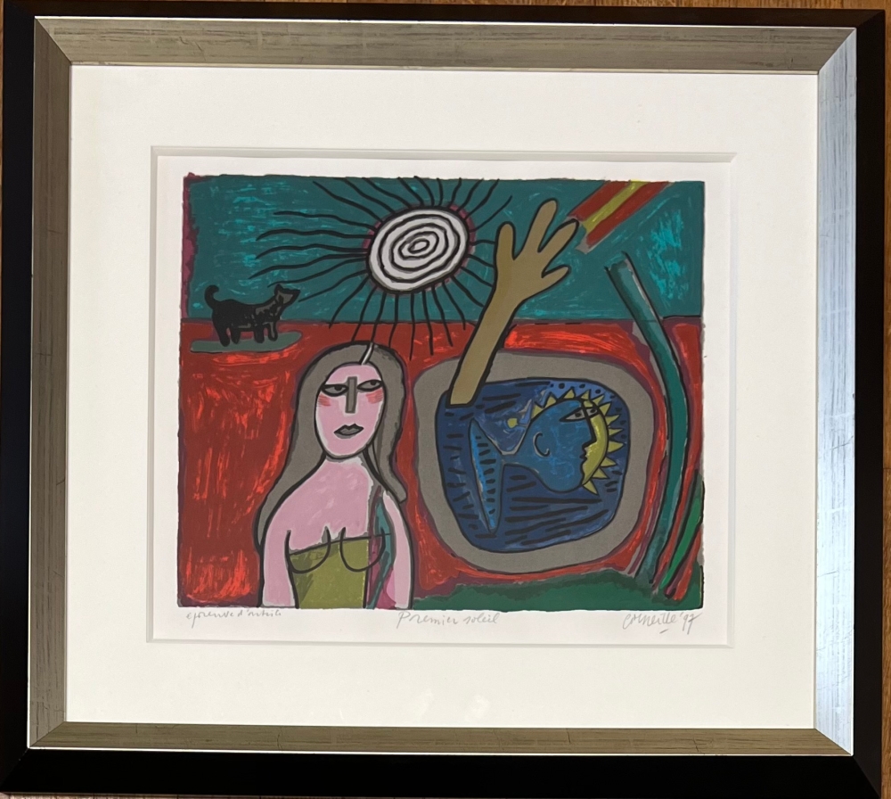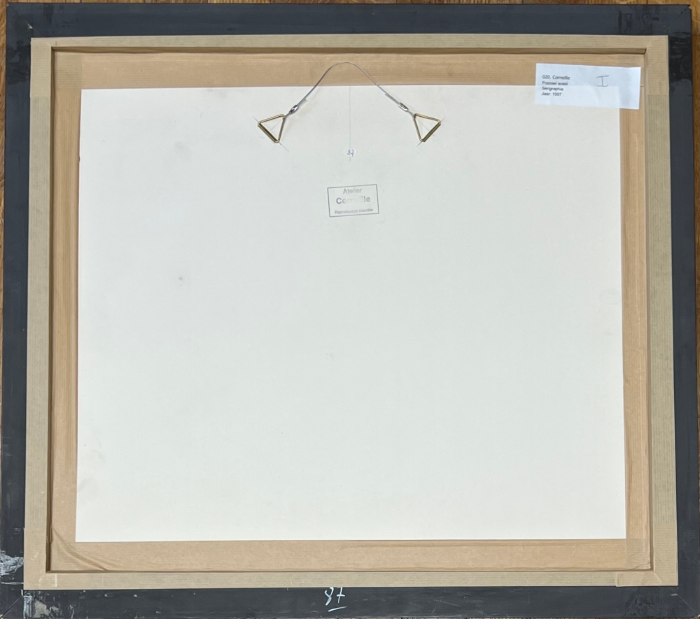 Cobra tentoonstelling met de grootste Amerikaanse collectie van Corneille in Miami in voorjaar en zomer 2023. De Cobra-retrospectieve in het Cobra Museum in Amstelveen is net afgelopen op 15 januari. Uitbrengen van een Cobra / Corneille postzegel door Bpost in 2023 Sieraden van Corneille te zien in de Boghossian Foundation tot 14 mei 2023 (Ornamentum, Collectie Diane Venet) Massief houten lijst met zilveren randen, gemaakt door Corneille tijdens zijn leven. Stempel Atelier Corneille op de achterkant. In het spoor van Gauguin en Matisse creëerde Corneille een joviaal en kleurrijk werk dat de harmonie met de natuur viert. Kat, vliegende vis of zonnevis, het denkbeeldige bestiarium van de schilder nodigt uit tot dagdromen. Originele zeefdruk van de schilder Guillaume Corneille (1922-2010), geboren in Luik uit Nederlandse ouders, stichtend lid van de Cobra-beweging. Onderaan gesigneerd, getiteld en gedateerd in grafiet. Totale afmetingen : 64 x 70 cm - Afmetingen van het werk : 40 x 44 cm Zeer goede staat, de lijst die meer dan 20 jaar oud is vertoont sporen van slijtage en krassen - Veilige verzending met verzekering door UPS in een kartonnen doos.