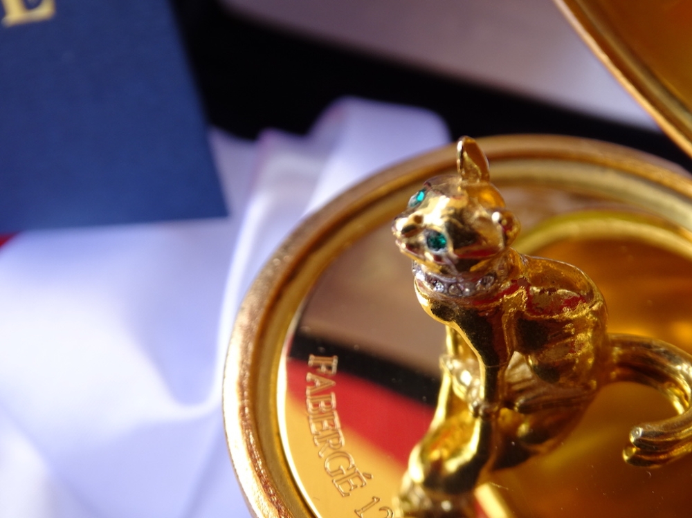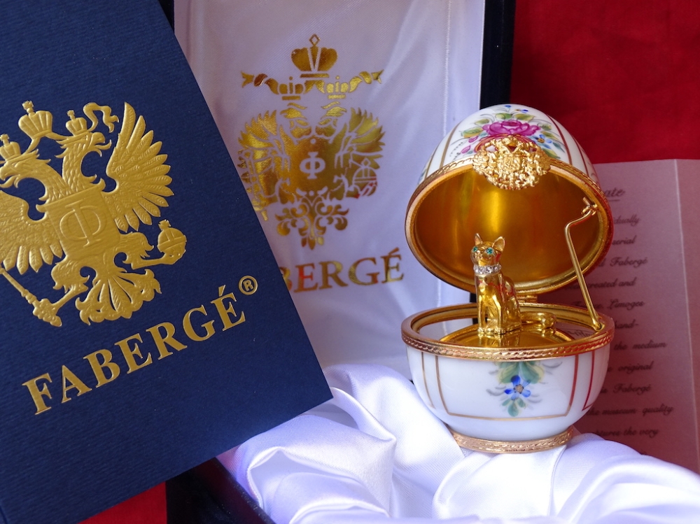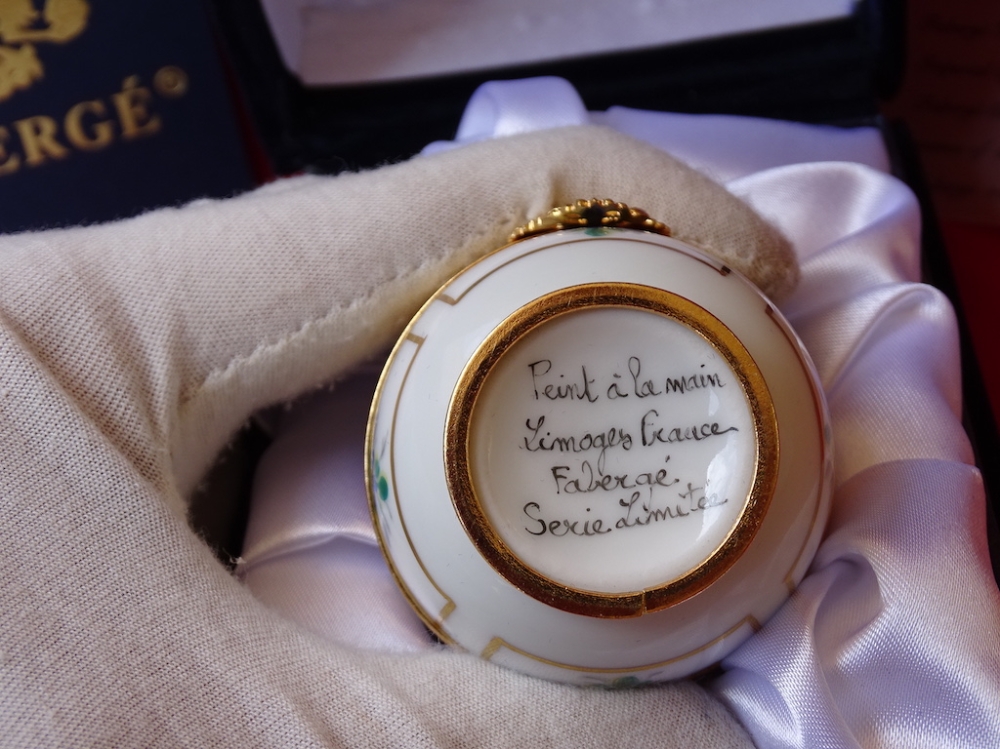 Imperial Egg - 24-karaats gouden afwerking Originele doos erbij 24 karaat verguld, fijn Limoges porselein Dit ei is exclusief gemaakt door Maison Fabergé. Het is een zeer gewaardeerd object op de kunstmarkt. Ei met een zeer mooie glans. De set is in zeer goede, uitstekende staat. Zie de vele foto's om een goed beeld te krijgen van alle details en mooie artwork op dit ei.