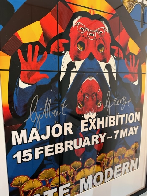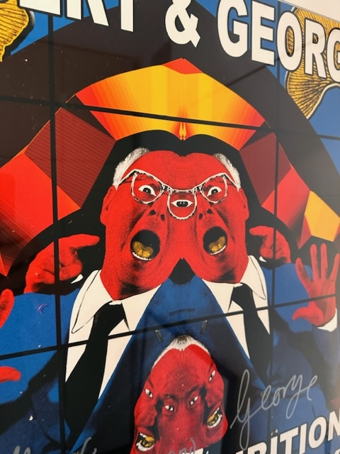 Prachtige kleurrijke affiche van Gilbert and George. Met de hand gesigneerd en in kader. Gilbert & George is een Engels-Italiaans kunstenaarsduo, bestaande uit Gilbert Prousch, en George Passmore. Hun carrière als kunstenaarsduo begon in de late jaren zestig en duurt nog altijd voort. Gilbert & George werden bekend met performances en grote fotowerken achter glas