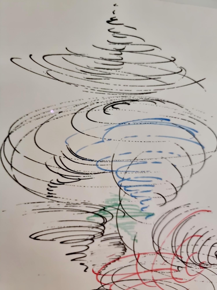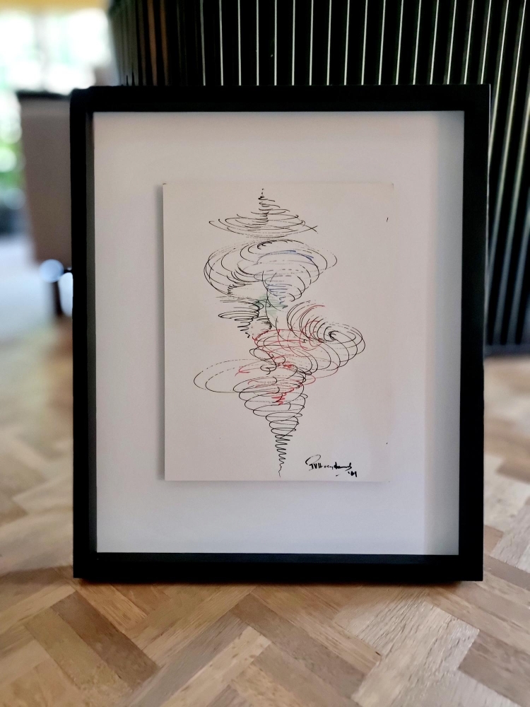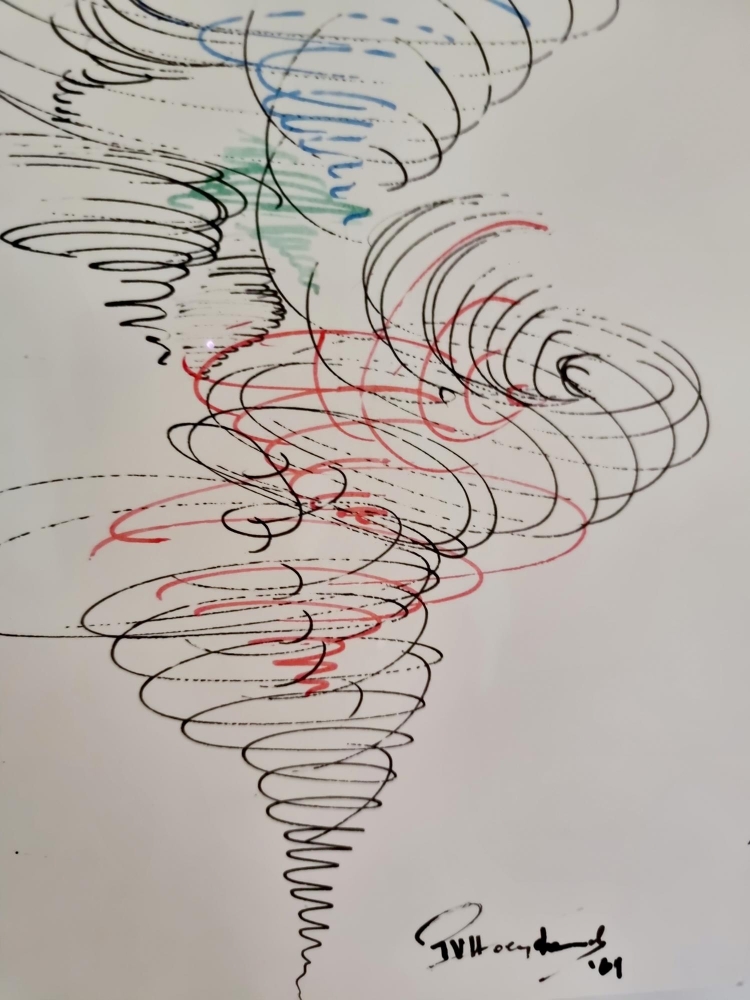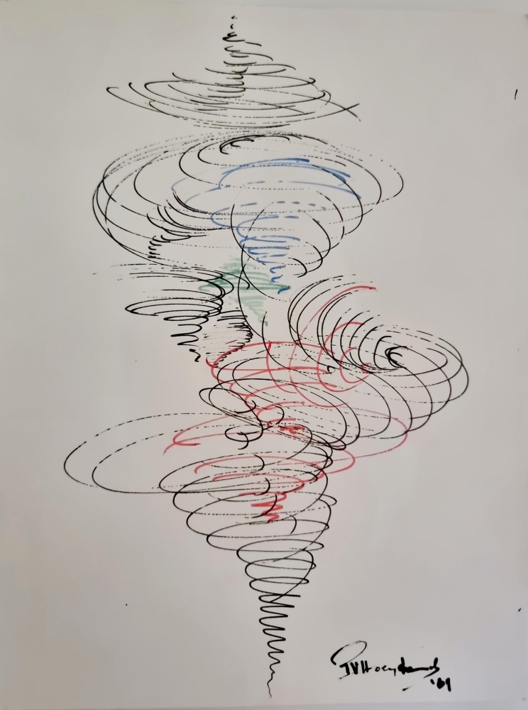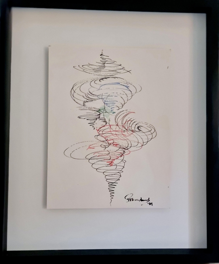 Origine en typische kleuren-inkttekening van Paul van Hoeydonk uit 1969. Gesigneerd rechtsonderaan door de kunstenaar. Tekeningen vormen een rode draad doorheen het rijke gevariëerde oeuvre van Paul Van Hoeydonck. Op de homepage van de website van de kunstenaar is een soortgelijke tekening te zien. Professioneel ingelijst.