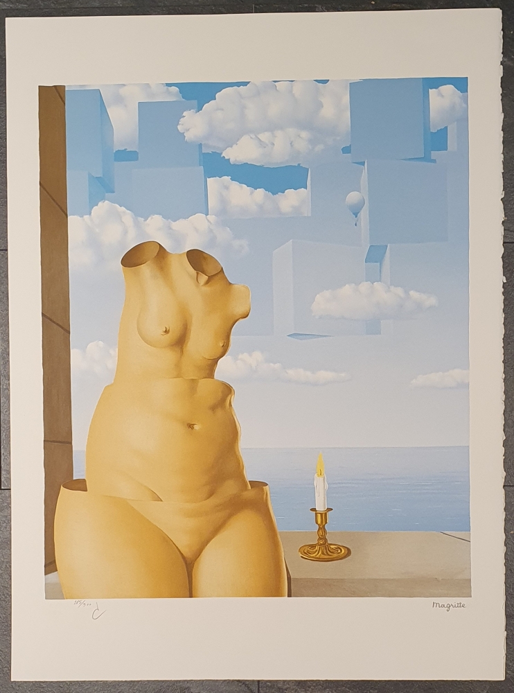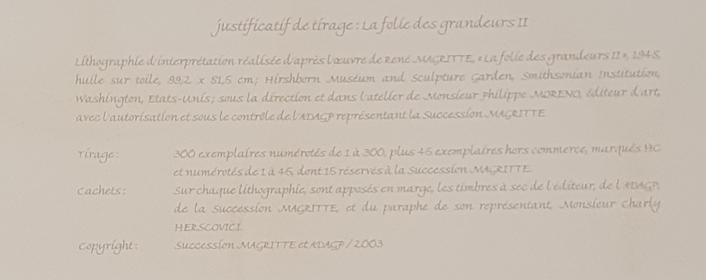 Zeer mooie en kleurrijke kleurenlithografie (2003) naar het origineel werk van Magritte 'La folie des grandeurs II' uit 1948 uitgebracht door het atelier van Philippe Moreno met toelating en onder controle van het ADAGP die de nalatenschap van René Magritte vertegenwoordigd. De handtekening van Magritte is gedrukt. Het werk is geparagrafeerd door Charly Herscovici, vertegenwoordiger van de nalatenschap Magritte. Het werk is genummerd 254/300 en bevat tevens droogstempels van de uitgever ADAGP en de nalatenschap Magritte. Het werk is nooit ingekaderd geweest en verkeert in zeer goede staat. De galerijprijs voor dit werk is 1500 à 2000 euro.