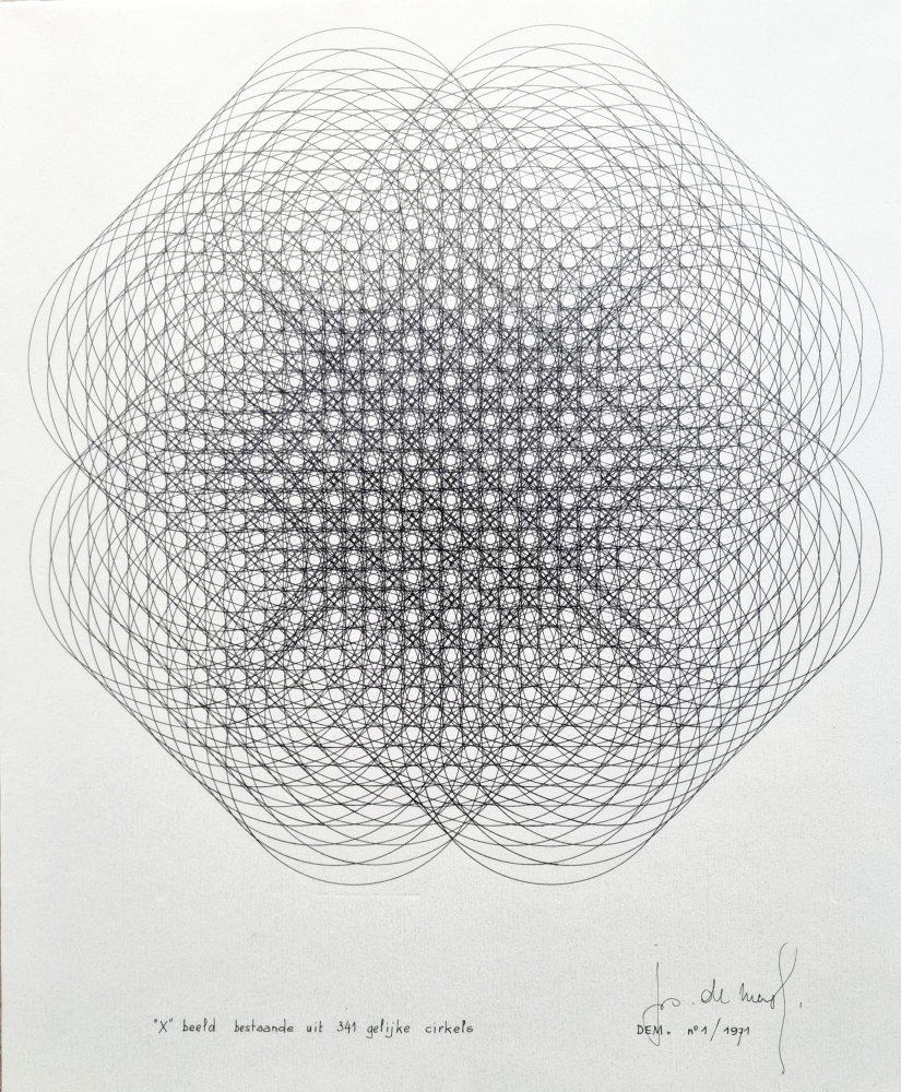 Prachtig origineel werk van Jos De Mey uit 1971 De tekening is gemonteerd op hardboard en geplastificieerd. 40 * 33 cm. Gesigneerd, gedateerd en getiteld ('X' beeld bestaande uit 341 gelijke cirkels) verso. In uitstekende staat.