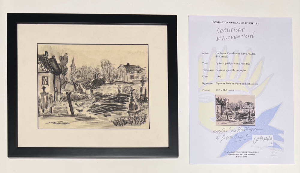 Fusain et aquarelle sur papier, fourni avec un certificat d'authenticité de la Fondation Guillaume Corneille. Guillaume Corneille apprend les techniques de dessin à la Rijksacademie voor Beeldende Kunsten d'Amsterdam. Reconnu comme une figure importante dans le renouvellement de l'abstraction dans le Nord de l'Europe, Corneille montre ici tout son savoir-faire quelques années plus tôt dans le dessin d'après nature. Corneille a 20 ans quand il réalise ce dessin. Dimensions : 16,5 x 21,5 cm Dimensions avec cadre : 28 x 33 cm. Très bon état - Envoi sécurisé par UPS - Tampon Atelier Corneille au dos. Provenance : Atelier Guillaume Corneille (1922-2010), peintre né à Liège de parents néerlandais et membre du groupe Cobra avec Karel Appel, Asger Jorn, Dotremont, Constant, Joseph Noiret, ou plus tard Alechinsky. Nous célébrons cette année les 100 Ans de la Naissance du peintre (Rétrospective Corneille jusqu'au 15 Janvier au Cobra Museum à Amstelveen)