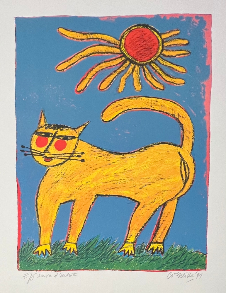 Iconisch werk dat moeilijk te vinden en gewild is geworden. Originele litho van de schilder Guillaume Corneille (1922-2010), geboren in Luik uit Nederlandse ouders en stichtend lid van de Cobra-groep met Karel Appel, Asger Jorn, Constant, Dotremont en later Alechinsky en Jacques Doucet Gesigneerd en gedateerd in potlood door de kunstenaar Artist's proof met Atelier Corneille stempel op de achterkant. Totale afmetingen: 62 x 46 cm - Zeer goede staat - Veilige verzending met UPS Tentoonstelling van 75 jaar Cobra sinds 1 juni in het Cobra Museum in Amstelveen. Opening van het Cobra-depot in Antwerpen. Uitgave van een Cobra/Corneille postzegel bij Bpost in 2023 Corneille, geïdentificeerd als een belangrijke figuur in de vernieuwing van de abstractie in Noord-Europa, evolueerde vanaf 1967 geleidelijk naar een rijke en kleurrijke nieuwe figuratie die coördineerde met de popart-smaak van de jaren zestig en zeventig, en exposeerde naast Andy Warhol, Arman, César, enz.
