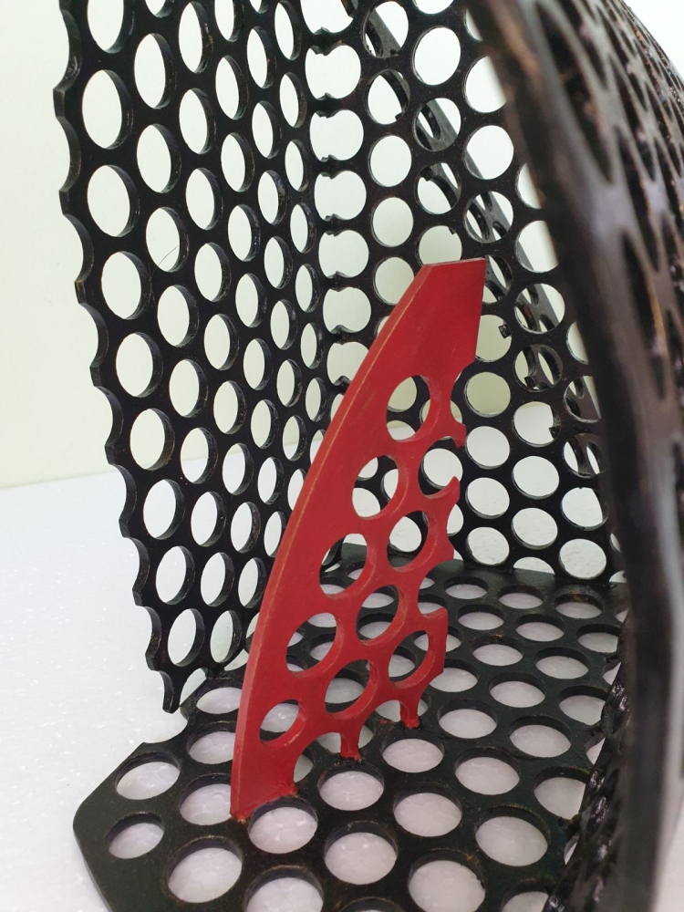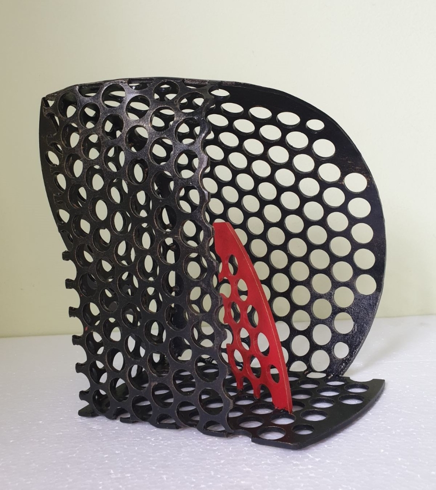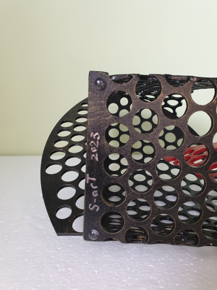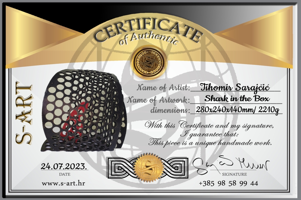 Bureau kunst/sculptuur/haai in doos afmeting280x240x140 mm, 2210g materiaal: koolstofstaal kleur: zwart met goudwas, rood, beschermd door een transparante toplaag...... Het beeld toont een haai die een uitweg uit de doos zoekt, net als wij mensen die soms gevangen zitten en een uitweg zoeken uit de problemen.... Uniek werk Uniek werk, geleverd met certificaat van echtheid. BELANGRIJKE OPMERKING: ALLEEN VERZENDING NAAR DE EU - GEEN VERZENDING NAAR NIET-EU-LANDEN. Tihomir Sarajcic is de eigenaar van de Kroatische ambachtelijke studio/werkplaats "S-art", die sculpturen componeert met gelast en geverfd ijzer/metaal, kunst aan de muur en schilderijen. Tentoonstellingen sinds 2015 en 2017 in de stadsbibliotheek van Slavonski Brod. De S-art studio neemt ook deel aan kunstfestivals...