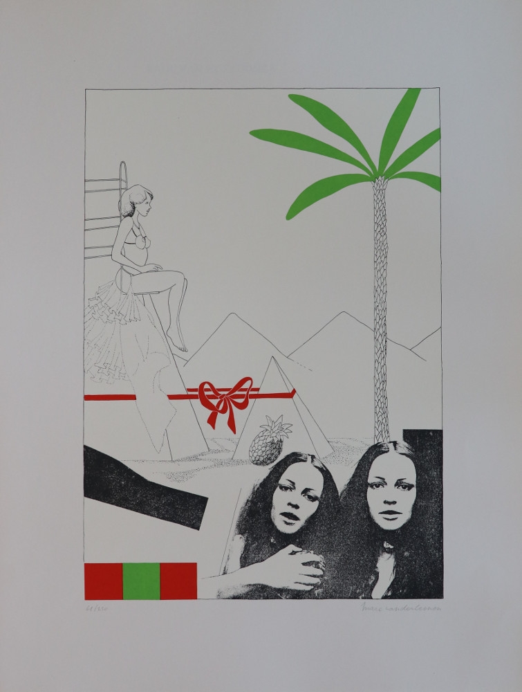 Zeefdruk van Marc Vanderleenen. Getekend en genummerd op 250 exemplaren. De in Mechelen opgegroeide kunstenaar, Marc Vanderleenen (1952, Mechelen) is in zijn werk steeds op zoek naar een gelaagdheid van het beeld waarvan de betekenis niet direct duidelijk leesbaar moet zijn voor de toeschouwer. Hij toont beelden van een existentiële radeloosheid; oefeningen in het niet tot nauwelijks articuleren, noemt hij het zelf.