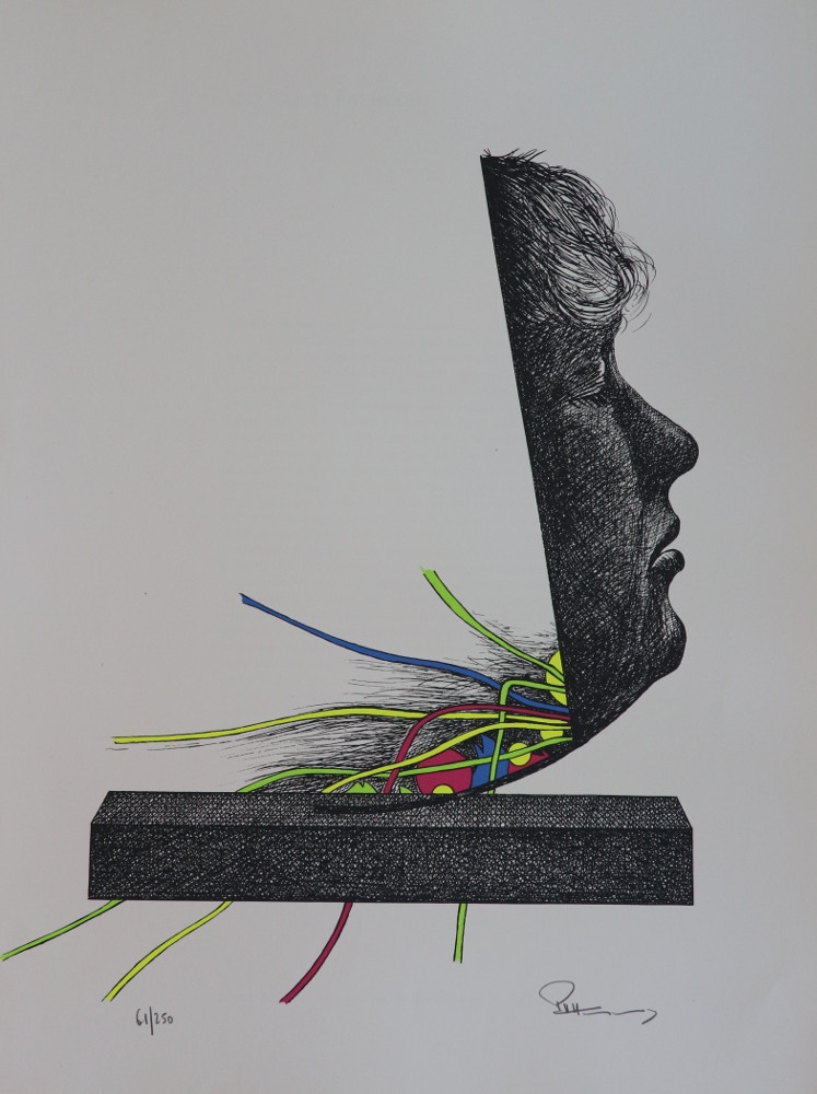 Zeefdruk van Paul Van Hoeydonck. Getekend en genummerd op 250 exemplaren. Geboren in 1927 te Brussel. Hij studeerde aan het Kunsthistorisch Instituut in Antwerpen en toonde vooral belangstelling voor de aanwezigheid van de mens in de ruimte. Hij gaf de planeten en de constellaties een plaats in zijn schilderijen. In 1971 zetten de astronauten van de Apollo 15 zijn beeldje "Fallen Astronaut" op de maan.