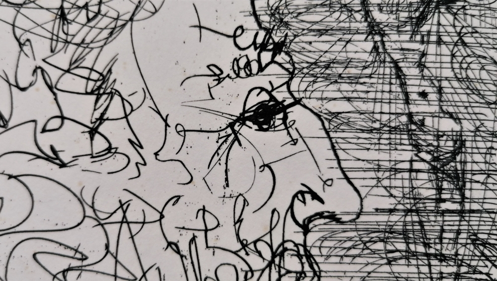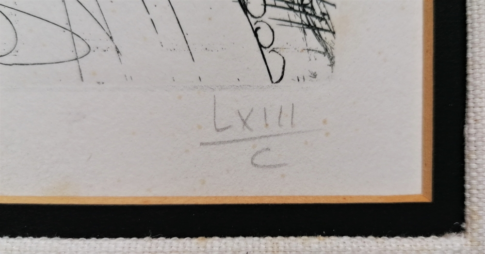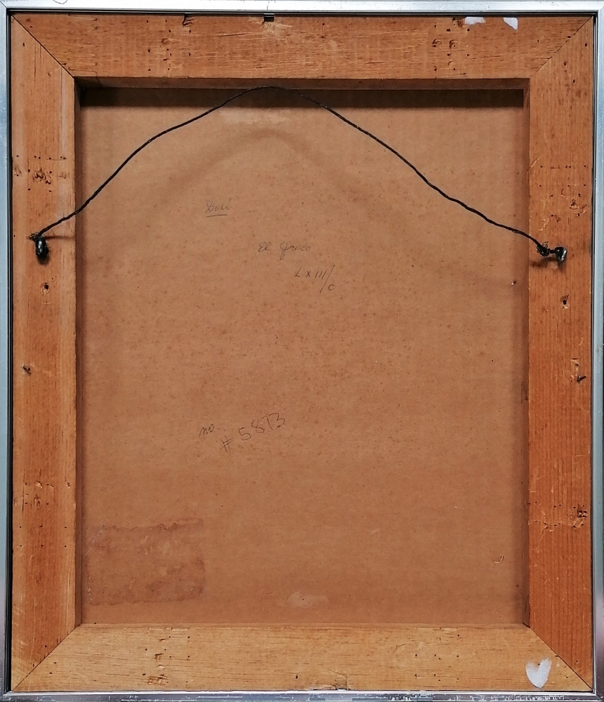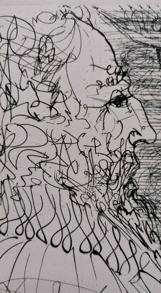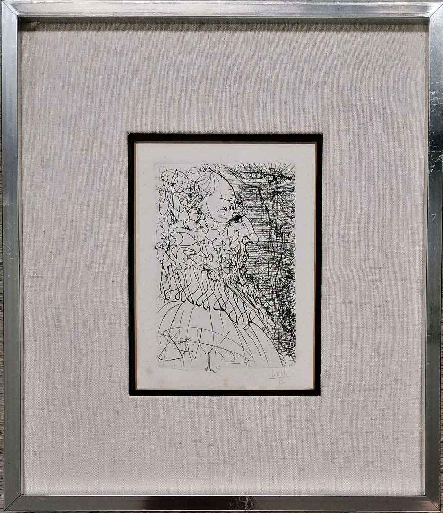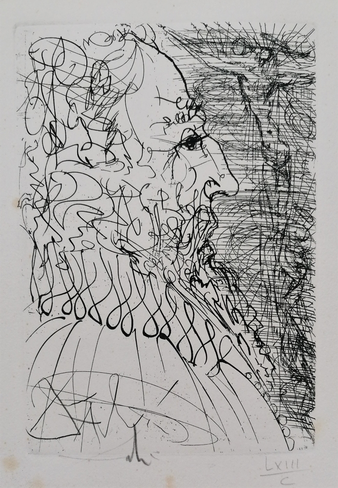 Salvador DALI (1904-1989) Mooie ets getiteld El Greco Het werk is gesigneerd in potlood en genummerd met Romeinse cijfers onderaan. De afmetingen zijn 17.5 bij 12 cm en het papier is 35 bij 28 cm In een zilverkleurig metalen kader van 43 bij 37 cm